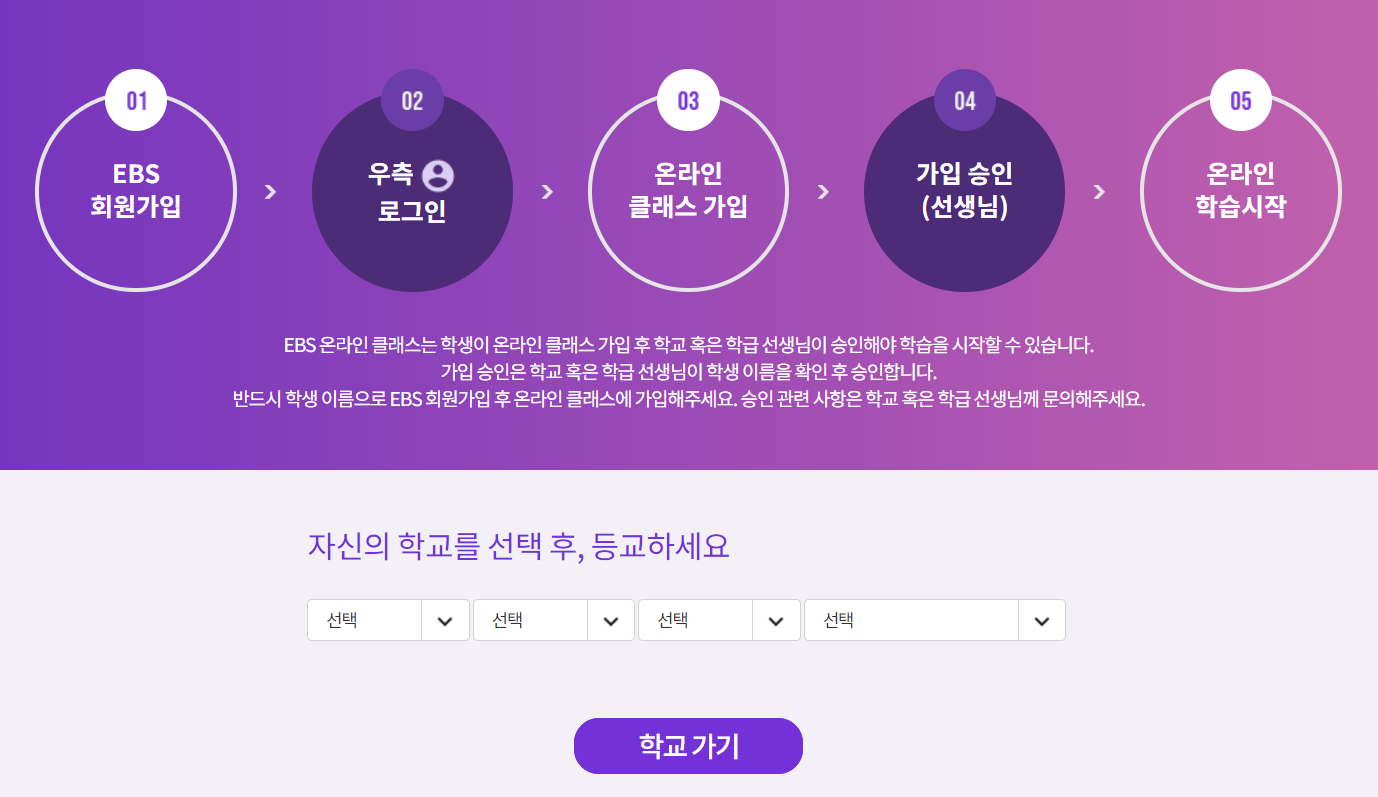 oc.ebssw.kr에서 학교를 선택하신 후 로그인을 하셔야 합니다.
